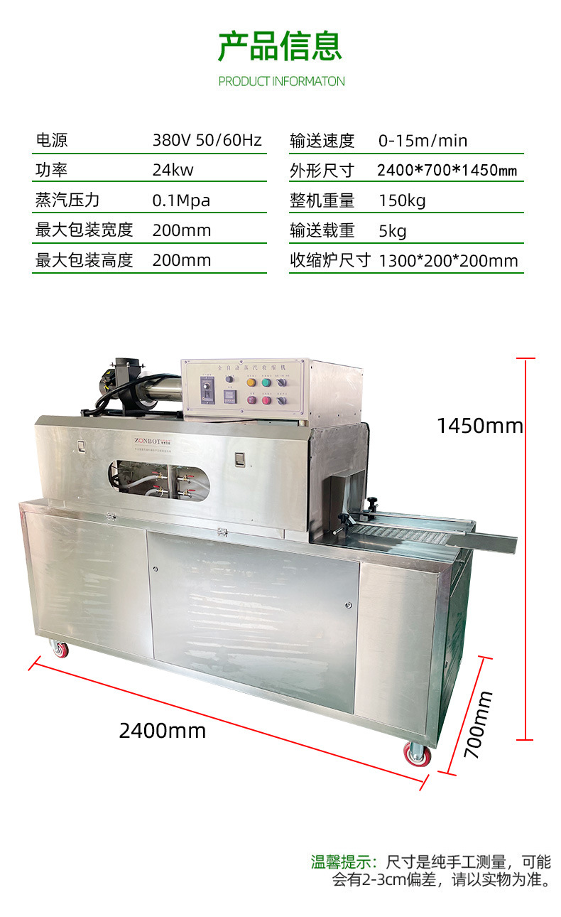 收縮速度快:蒸汽的高熱量能夠快速傳遞給包裝膜,使包裝膜迅速收縮,提高包裝效率,可適用于高速生產(chǎn)線,滿足大規(guī)模生產(chǎn)的需求.