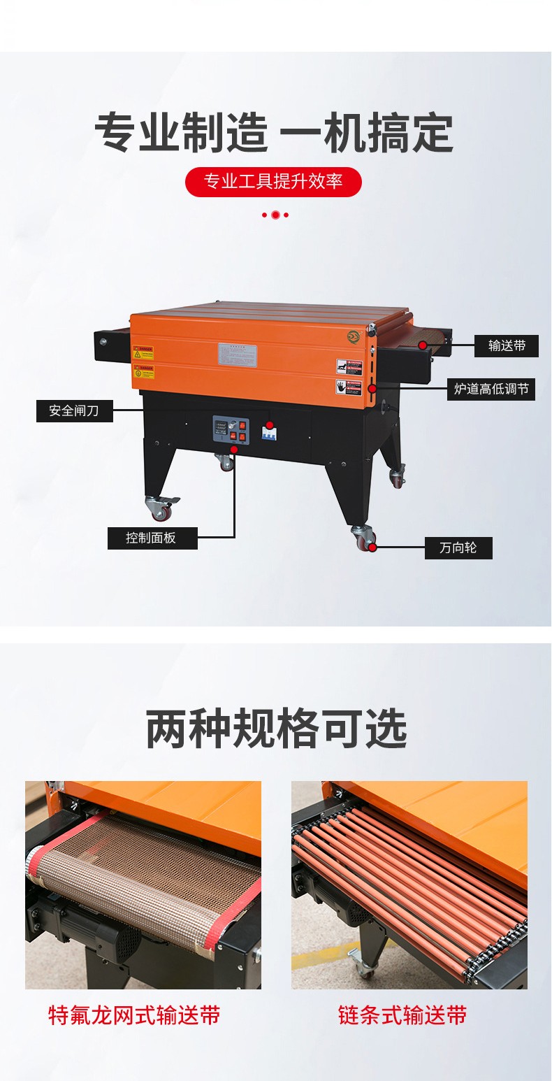 - 輸送速度可調:輸送速度可以根據包裝需求靈活調整。可以根據產品的大小、形狀復雜程度以及生產效率的要求來設置合適的輸送速度。比如,在包裝簡單的小型產品時,可以提高輸送速度,以提高包裝效率;而在包裝大型或形狀不規(guī)則的產品時,適當降低輸送速度,確保熱空氣有足夠的時間使薄膜充分收縮,從而保證包裝質量。