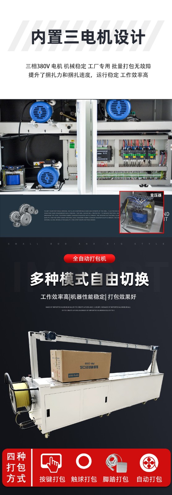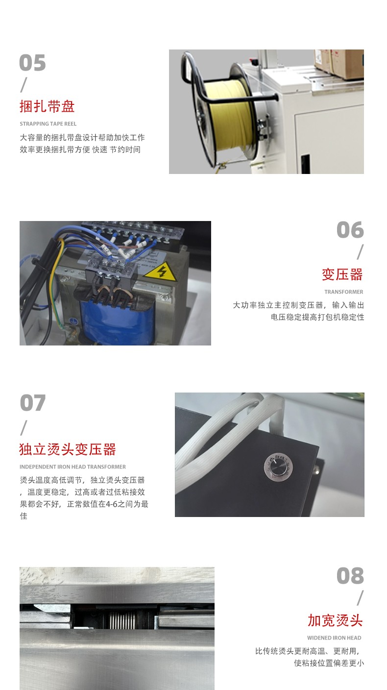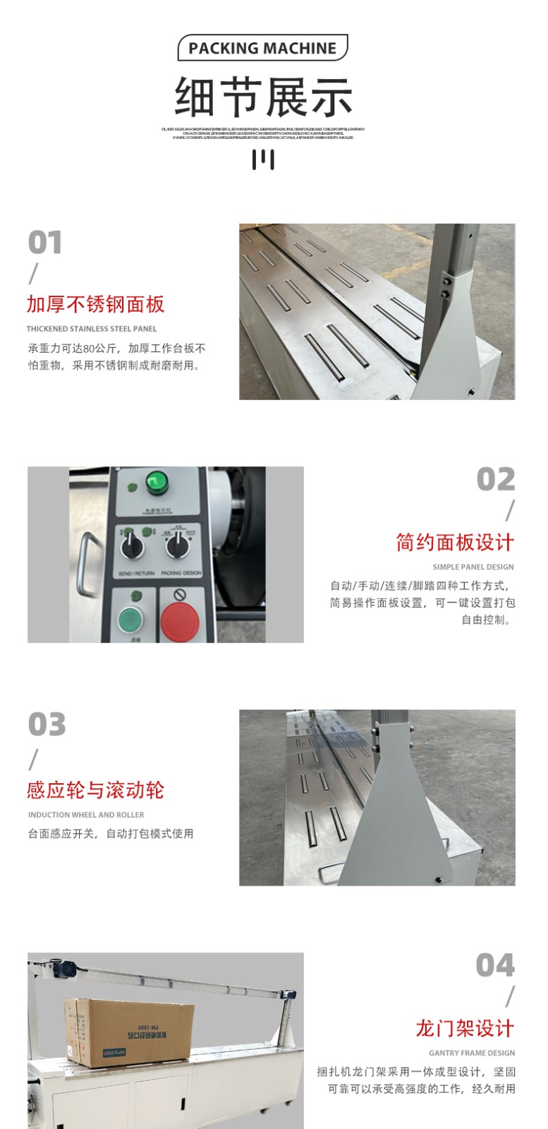 - 智能化控制系統:配備先進的微電腦控制系統,可精準設定打包參數,如打包帶長度、加熱溫度、壓緊時間等,操作界面直觀易懂,操作人員能輕松根據不同物品的打包需求進行靈活調整。