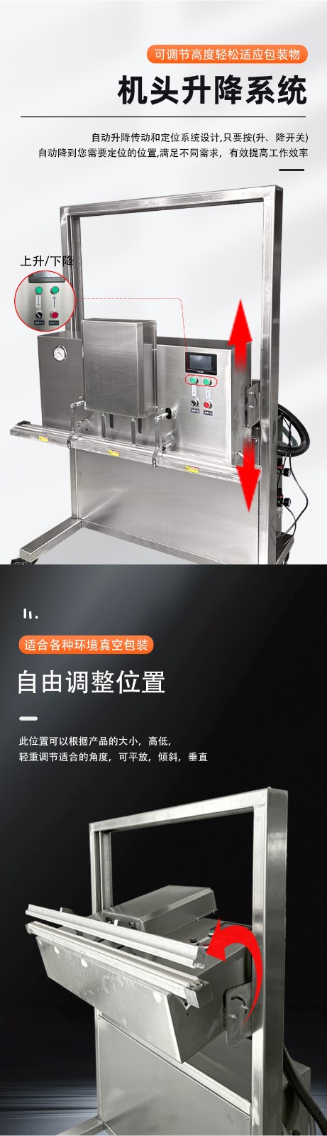 升降結構適配不同高度:工作臺或封口部件可靈活升降,例如 鼎業1200型號的立式真空包裝機,封口離地高度可調節;立式升降系列機型頭部可垂直無論是小袋零食,還是 50kg 的大袋大米、塑膠料,都能找到適配的包裝高度。