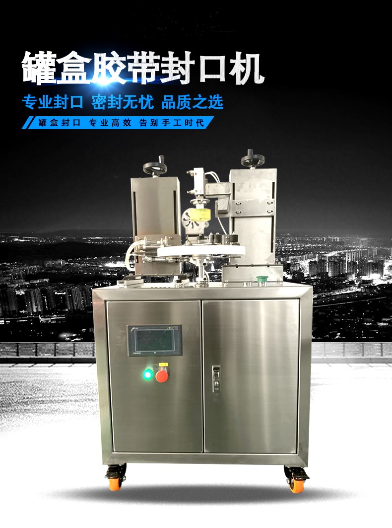 罐盒膠帶封口機適用于多種材質和形狀的包裝盒、罐,如鐵盒、馬口鐵罐、金屬罐、鋁合金罐、塑料盒、紙盒等,可用于巧克力盒、糖果盒、月餅盒、餅干盒、茶葉罐、奶粉罐、化妝品包裝盒等的封口。能使膠帶平整光滑地纏繞在罐口,無褶皺、氣泡,密封性佳,有效延長產品保質期??筛鶕煌墓藓谐叽绾托螤睿鼡Q相應的模具或調整設備參數,具有一機多用的特點。