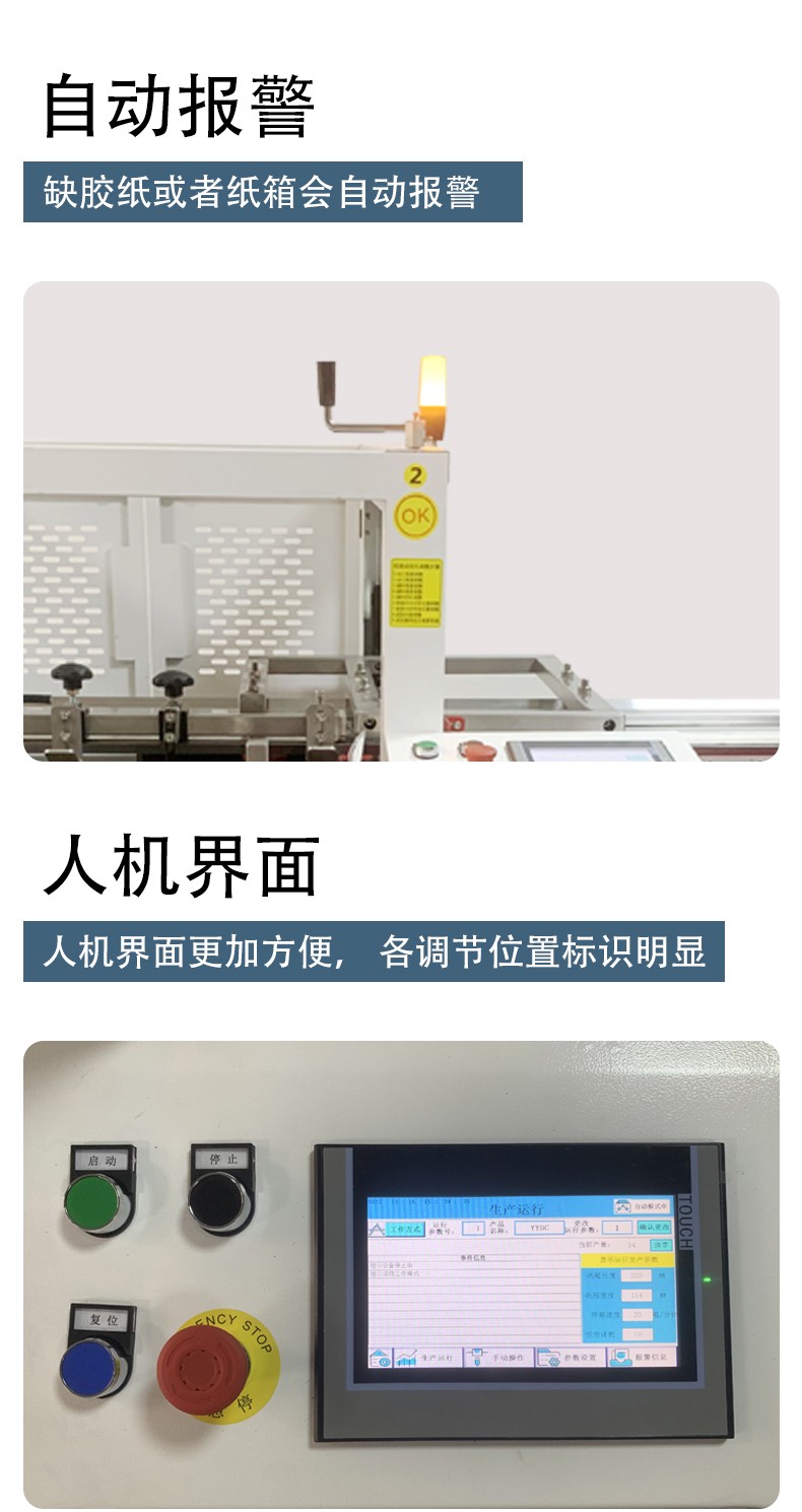 - 紙箱適應性強:適用紙箱范圍廣,不同大小紙箱調整簡便快捷,變換紙箱規格時,手動調整一般只需 1-2 分鐘。