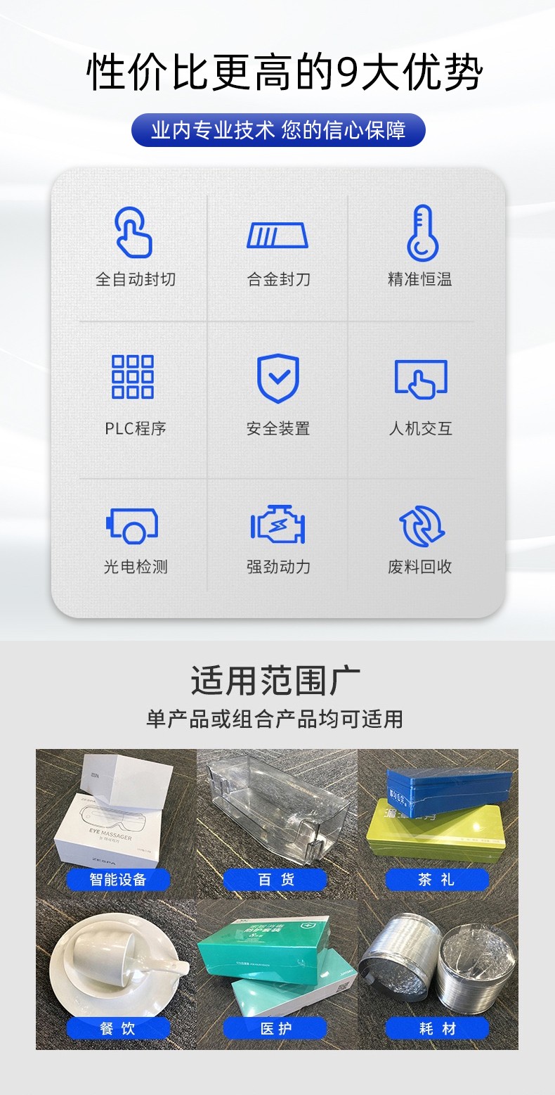 適合規則 / 不規則盒裝、瓶裝、禮盒裝產品(如食品禮盒、醫藥盒、日化套裝),尤其適配批量≥300 件 / 小時的生產線,相比 L 型封切機更適合易折皺、需精準封口的產品。
