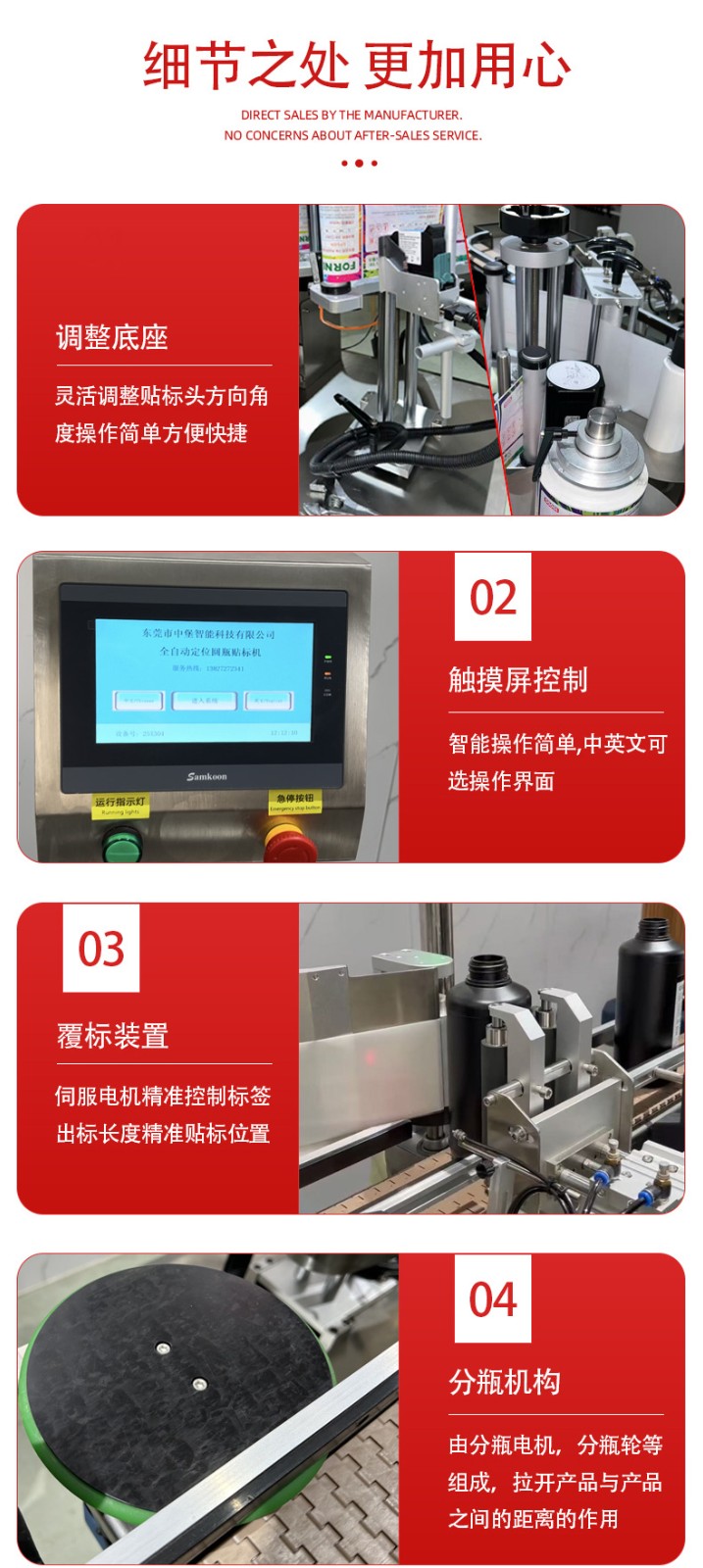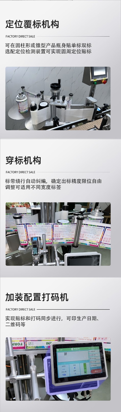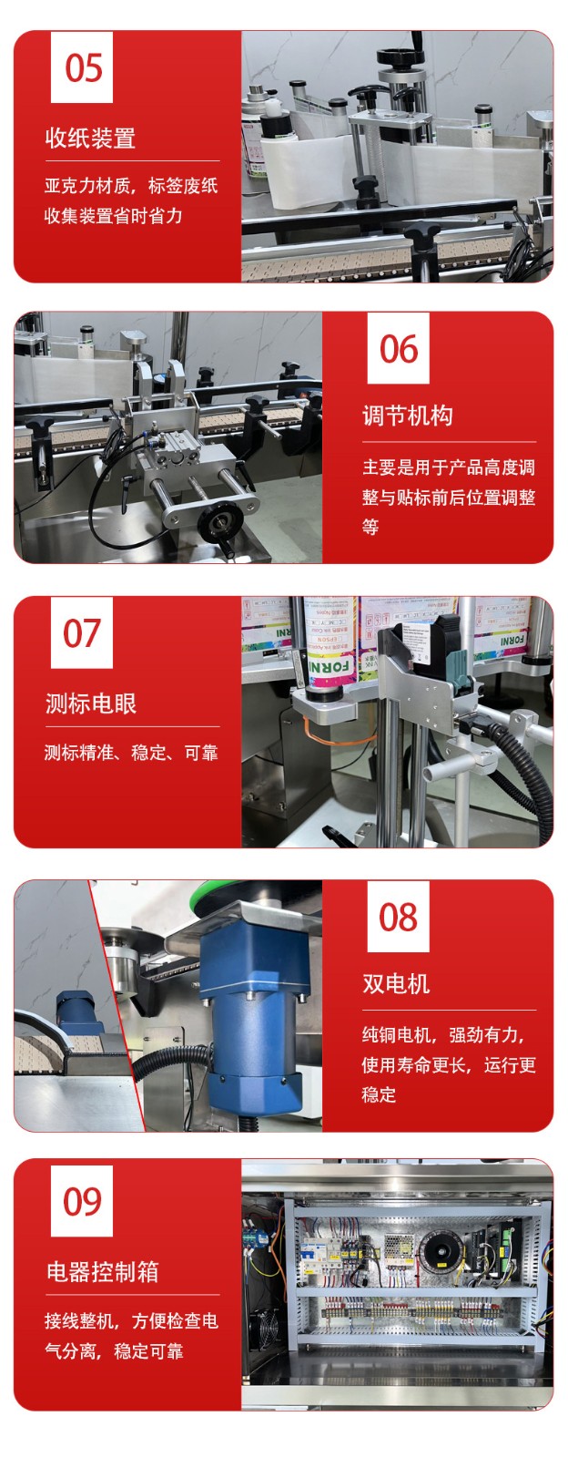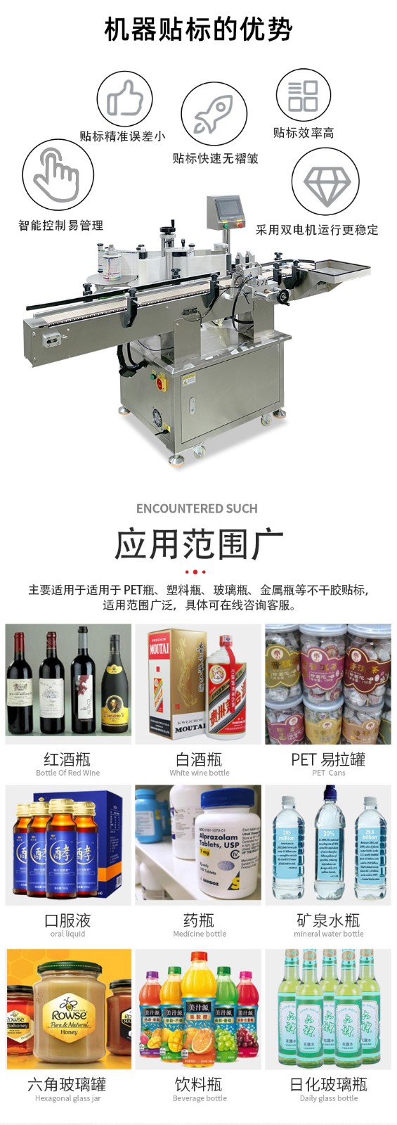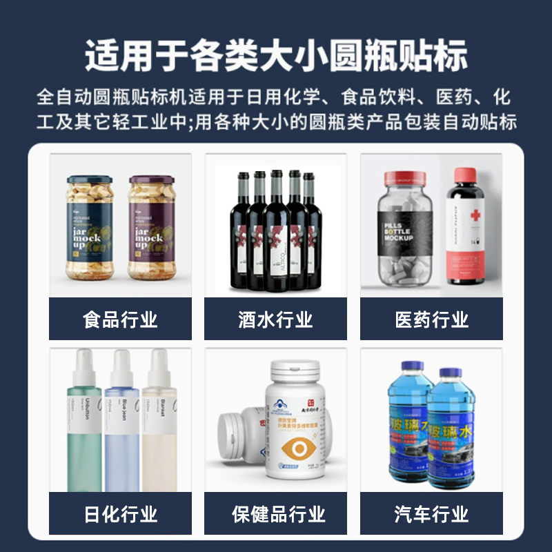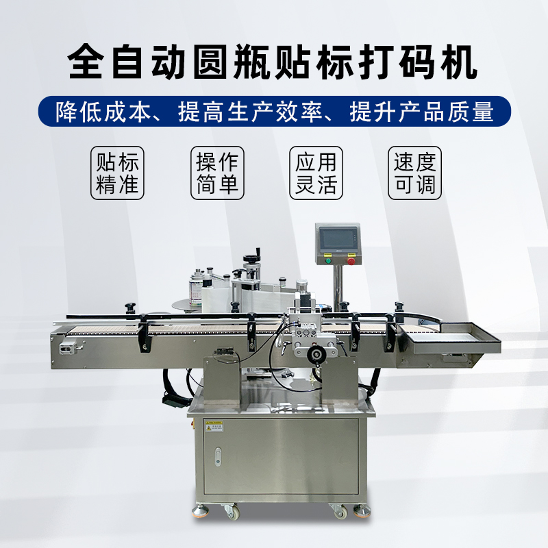 圓瓶類產(chǎn)品的貼標,可貼單標和雙標,正背雙標間距可靈活調(diào)整,部分機型還具備錐形瓶貼標功能。精準定位、高效智能、靈活兼容與合規(guī)耐用,可顯著提升產(chǎn)線自動化與貼標良率。