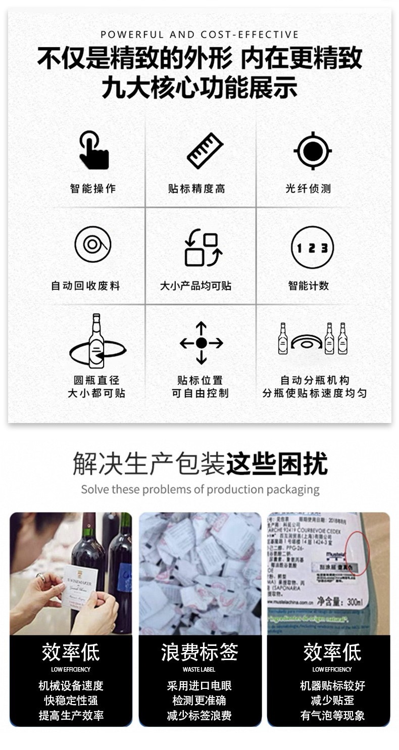 替代人工,降本提質(zhì):避免人工貼標歪斜、起泡、效率低等問題,穩(wěn)定貼標質(zhì)量,降低單位成本,提升產(chǎn)品包裝美觀度與競爭力。