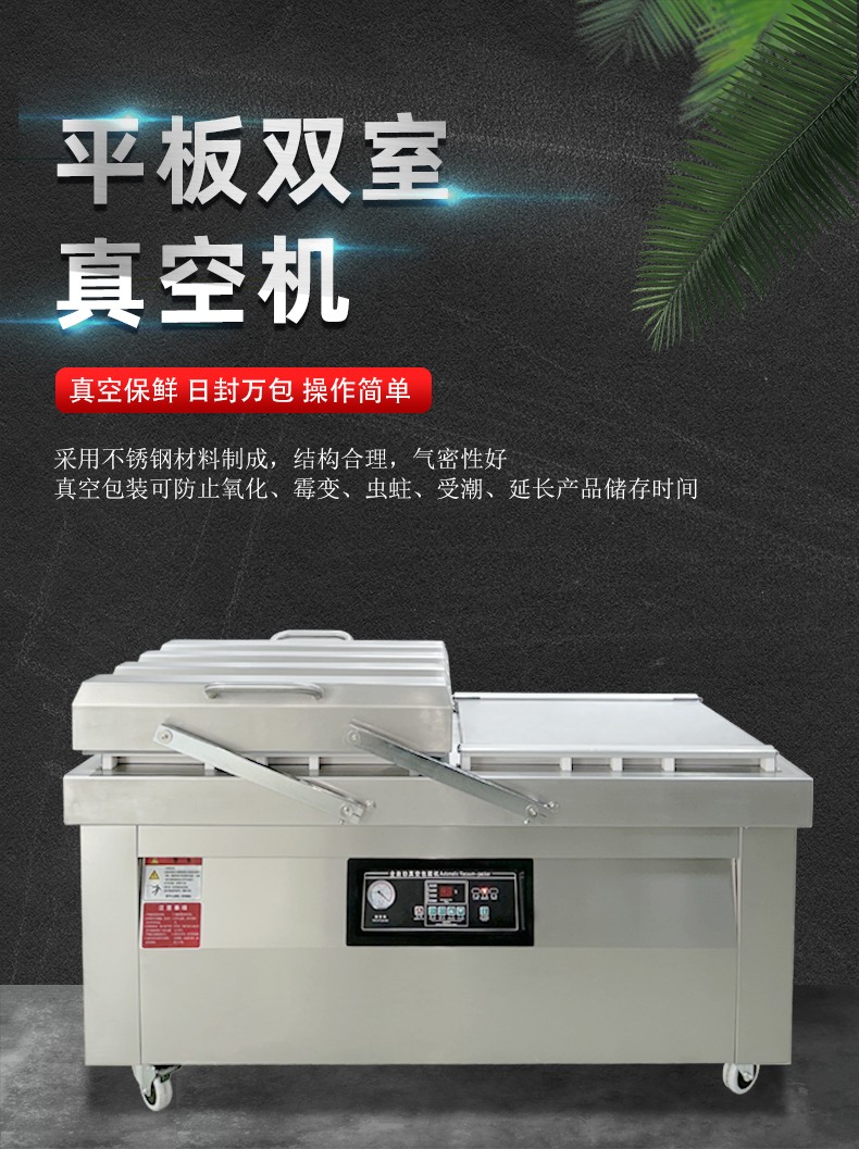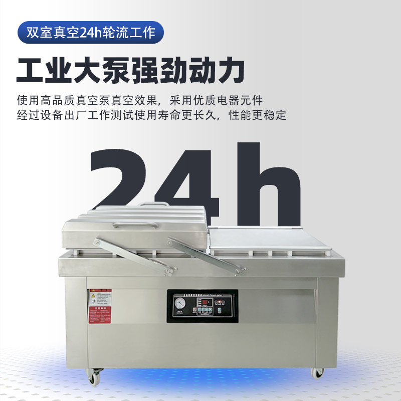 - 交替作業,效率提升 50% 以上雙室機型的兩個真空室可實現 “一工一備”:當其中一個真空室正在進行抽真空、熱封作業時,操作人員可以在另一個真空室完成物料擺放、袋口整理的準備工作。單室機型則必須等抽真空 - 熱封 - 開蓋取件整個流程結束后,才能進行下一批物料的擺放,存在明顯的操作等待空窗期。同等規格下,雙室機的單位時間包裝量是單室機的 1.5-2 倍,尤其適合中小型加工廠的連續批量生產。