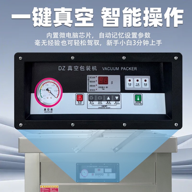 - 抽真空:壓下機蓋,面板上抽氣(真空)指示燈亮,真空泵開始抽氣,可通過抽真空旋鈕根據包裝要求調節真空度高低。