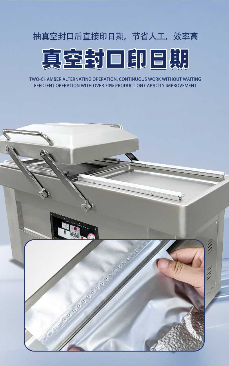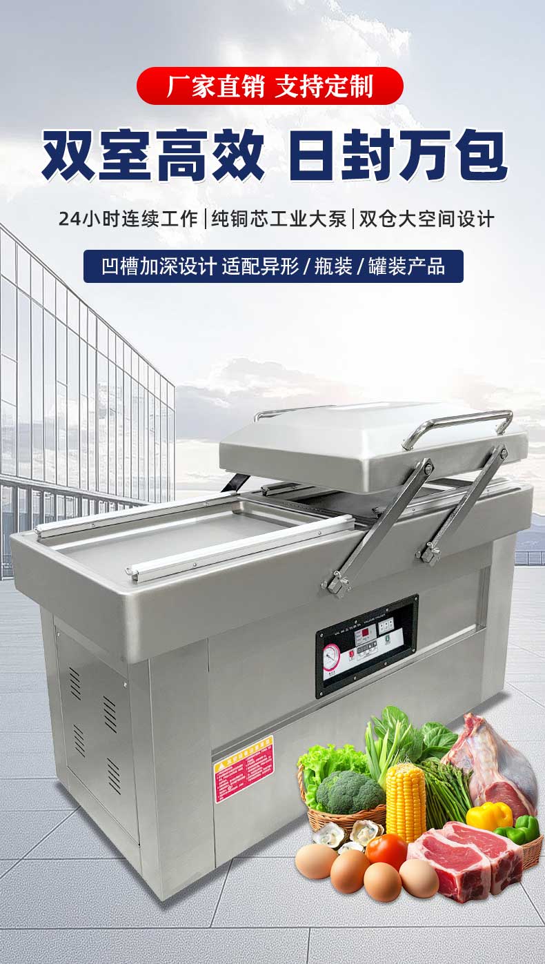 雙室真空包裝機可在真空包裝的基礎上,向包裝袋內充入氮氣、二氧化碳等惰性氣體或混合氣體,起到更好的防腐、防潮、防氧化等保質效果
