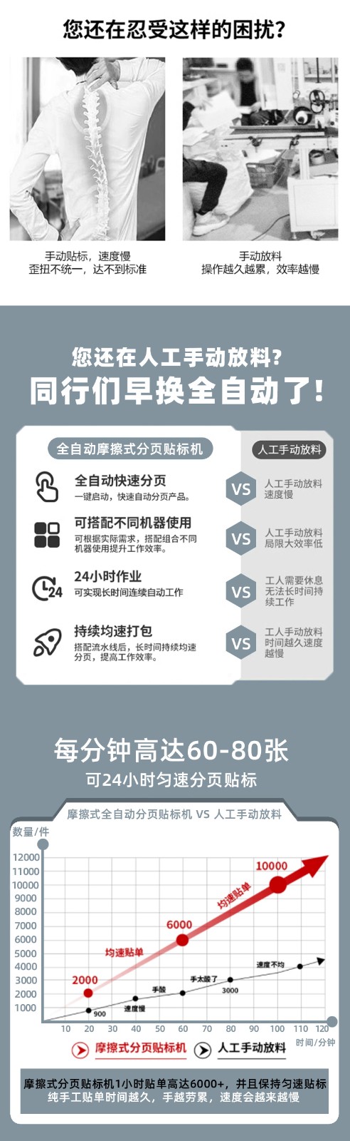 - 避免人為失誤成本:人工貼標(biāo)過程中,由于人的注意力和操作熟練程度等因素,難免會(huì)出現(xiàn)貼標(biāo)位置不準(zhǔn)確、標(biāo)簽歪斜、漏貼等失誤,這些失誤需要額外的人力進(jìn)行檢查和返工,增加了成本。全自動(dòng)分頁(yè)貼標(biāo)機(jī)則可以通過精確的定位和控制系統(tǒng),保證貼標(biāo)的準(zhǔn)確性和一致性,避免了因人為失誤帶來的成本增加。