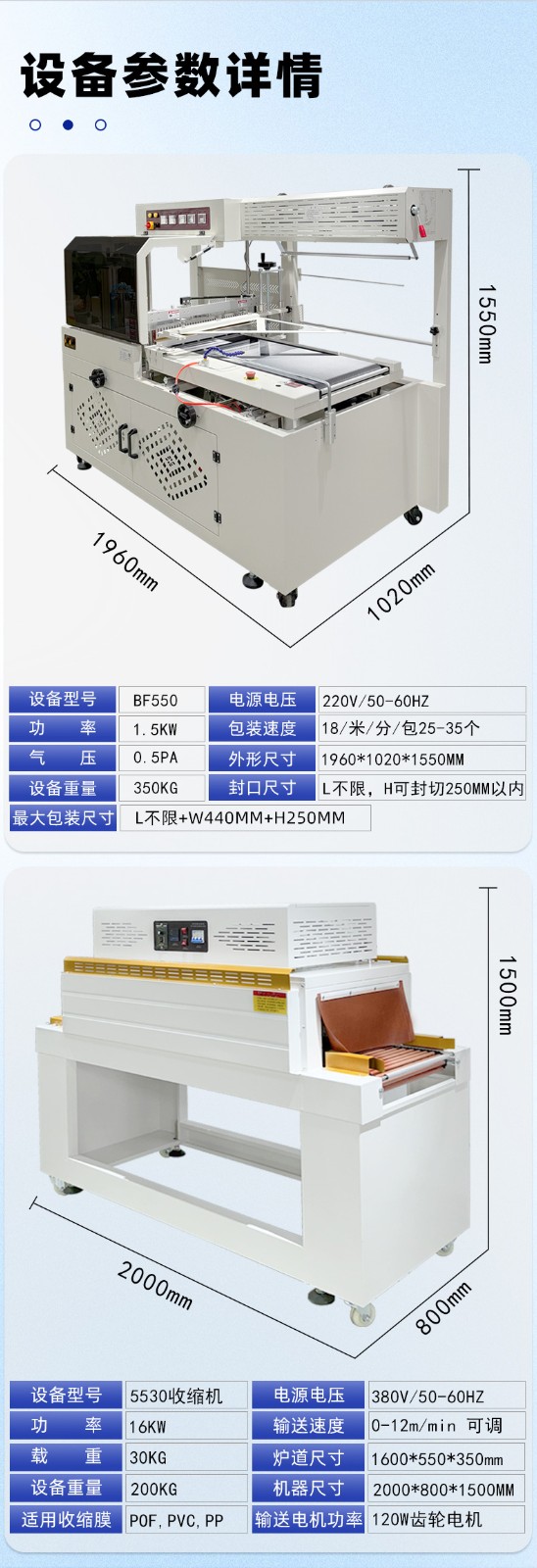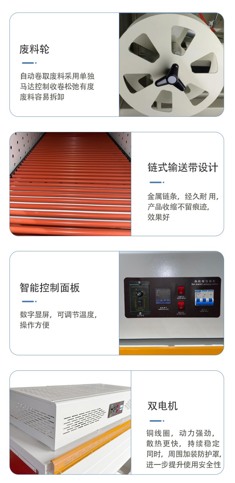 • 結構組成:一般由封切裝置、熱收縮爐、輸送系統、送膜機構和控制系統等組成。封切裝置用于對膜進行封口和切斷;熱收縮爐提供熱量使膜收縮;輸送系統負責傳送產品和包裝好的物品;送膜機構實現膜的輸送和定位;控制系統則用于設定和控制各部分的運行參數。