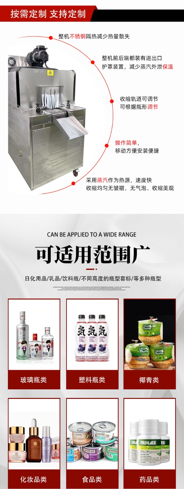 蒸汽的恒溫(通常溫度可控范圍 50-120℃)和擴散均勻性,能避免傳統(tǒng)熱風加熱導致的 “薄膜起皺、局部破裂” 問題,即使是異形產品(如不規(guī)則五金件、弧形瓶身),也能實現平整、無氣泡的收縮效果。 - 生產效率高:適配大規(guī)模量產需求