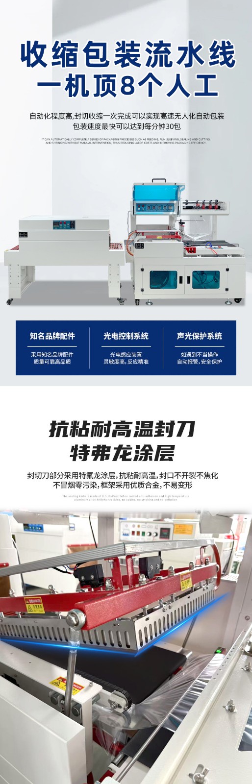 - 全程自動化操作,無需人工封切 / 套膜,單機包裝速度可達30-120 件 / 分鐘(根據產品尺寸調整,小產品速度更快),遠超手動包裝(約 5-10 件 / 分鐘),適合批量生產場景。
