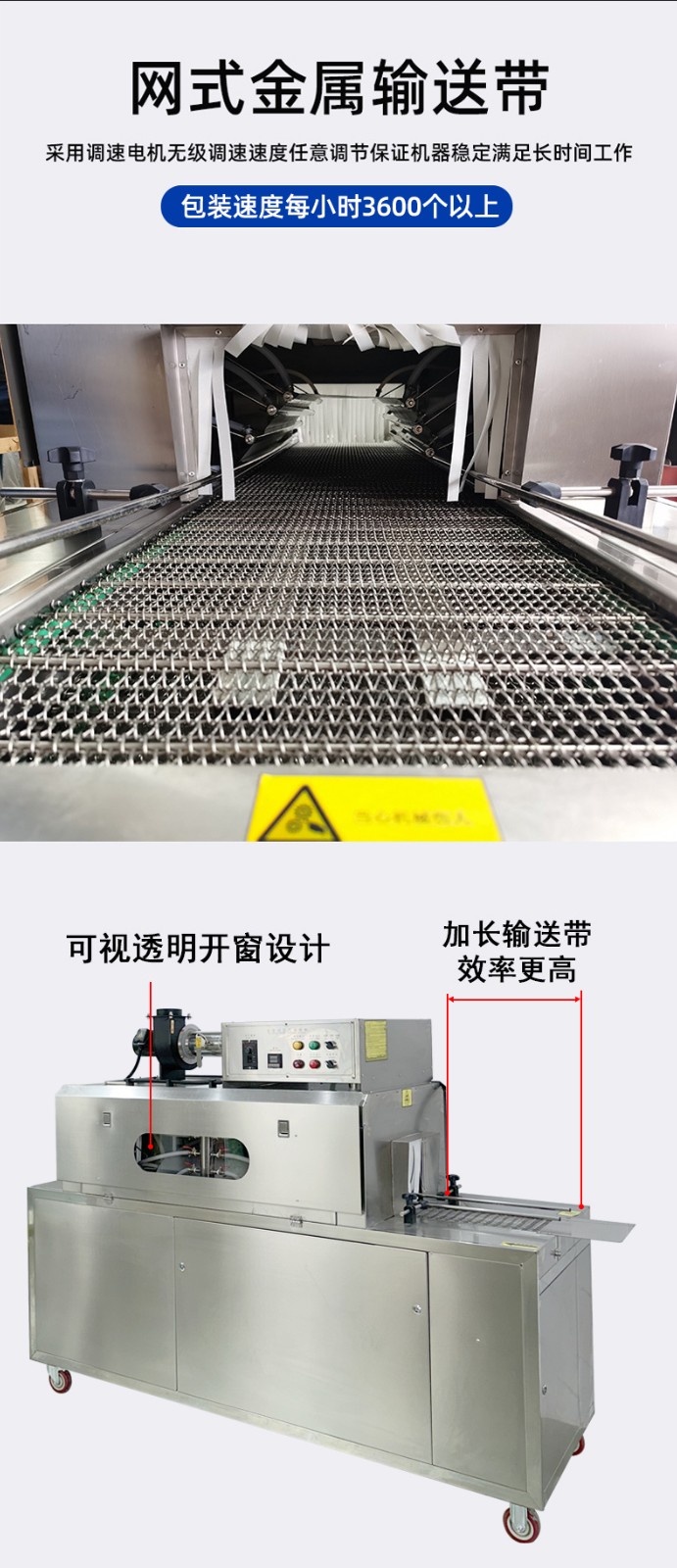 - 收縮效果均勻美觀收縮室采用環形蒸汽噴射設計,蒸汽能 360° 無死角包裹產品表面,使熱收縮膜受熱均勻,收縮后緊密貼合產品輪廓,無褶皺、無氣泡,即使是異形、棱角分明的產品(如五金工具、瓶裝飲料),也能實現平整光滑的包裝效果。